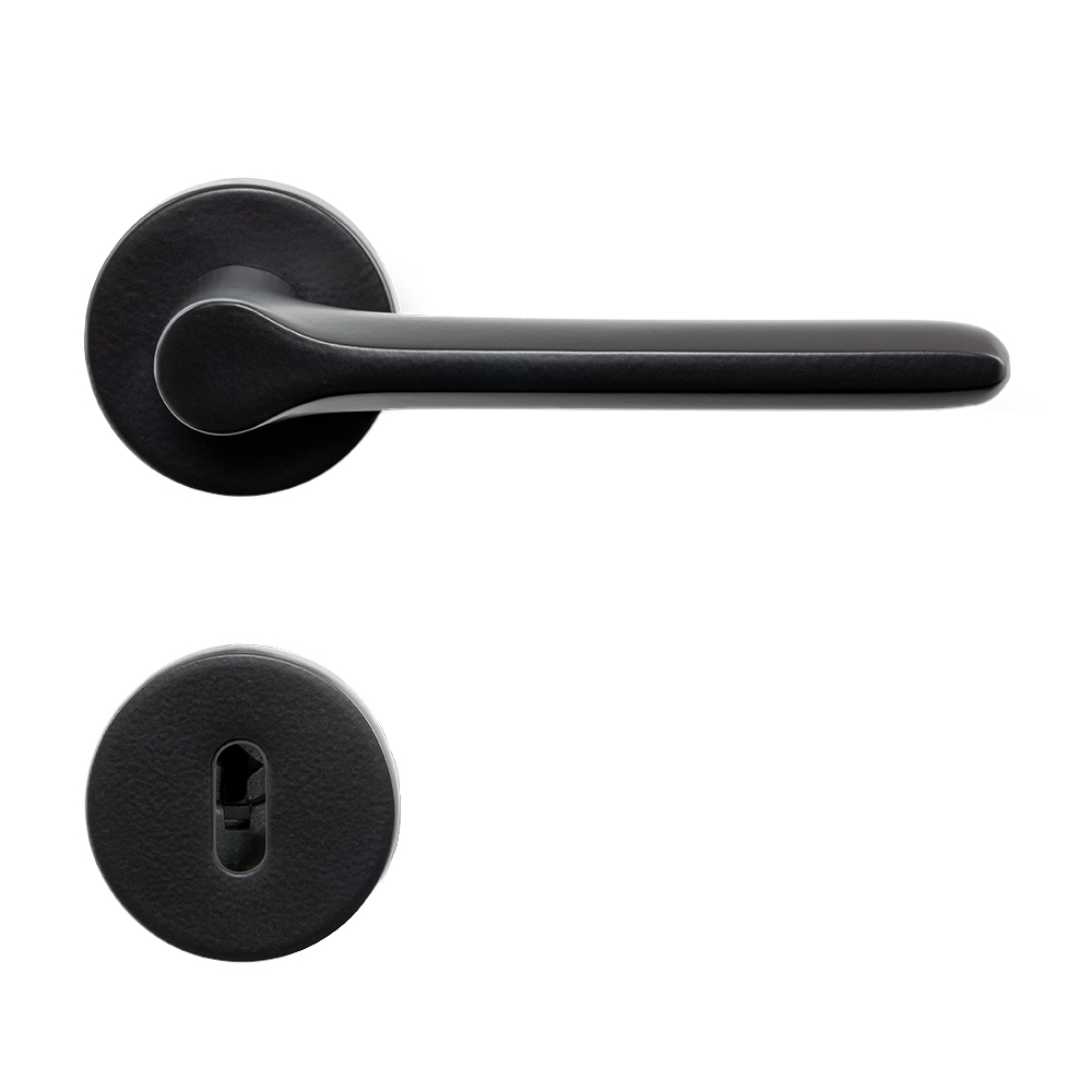 The handle is available in two different designs, matt black and in a stainless steel look. The door handle and keyhole are suitable for doors that are 35-48 mm deep. The door handle is adapted to European standards. Standard key plate, conversion kit and complete assembly kit are included.