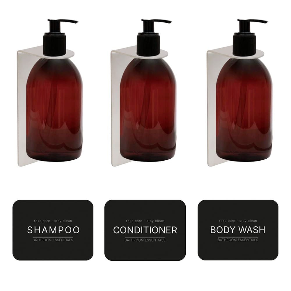 This shower package is the ultimate solution for a stylish and well-organized shower. The set includes three elegant soap pump holders, which are easily and conveniently mounted using 3M tape that comes pre-applied to the product. This means you won't need to drill any holes in your wall, making the installation both quick and simple. The soap pump holders come with three brown soap pumps featuring a modern and sleek design. The pump heads are easy to use and provide an even dispensing of the contents. To further enhance convenience, labels with the text "Shampoo," "Conditioner," and "Body Wash" are included and can be attached directly to the bottles. This makes it easy to quickly identify the right product while creating a uniform and elegant look. With this set, you get not only a practical storage solution for your shower but also an aesthetically pleasing design that is easy to install and maintain.